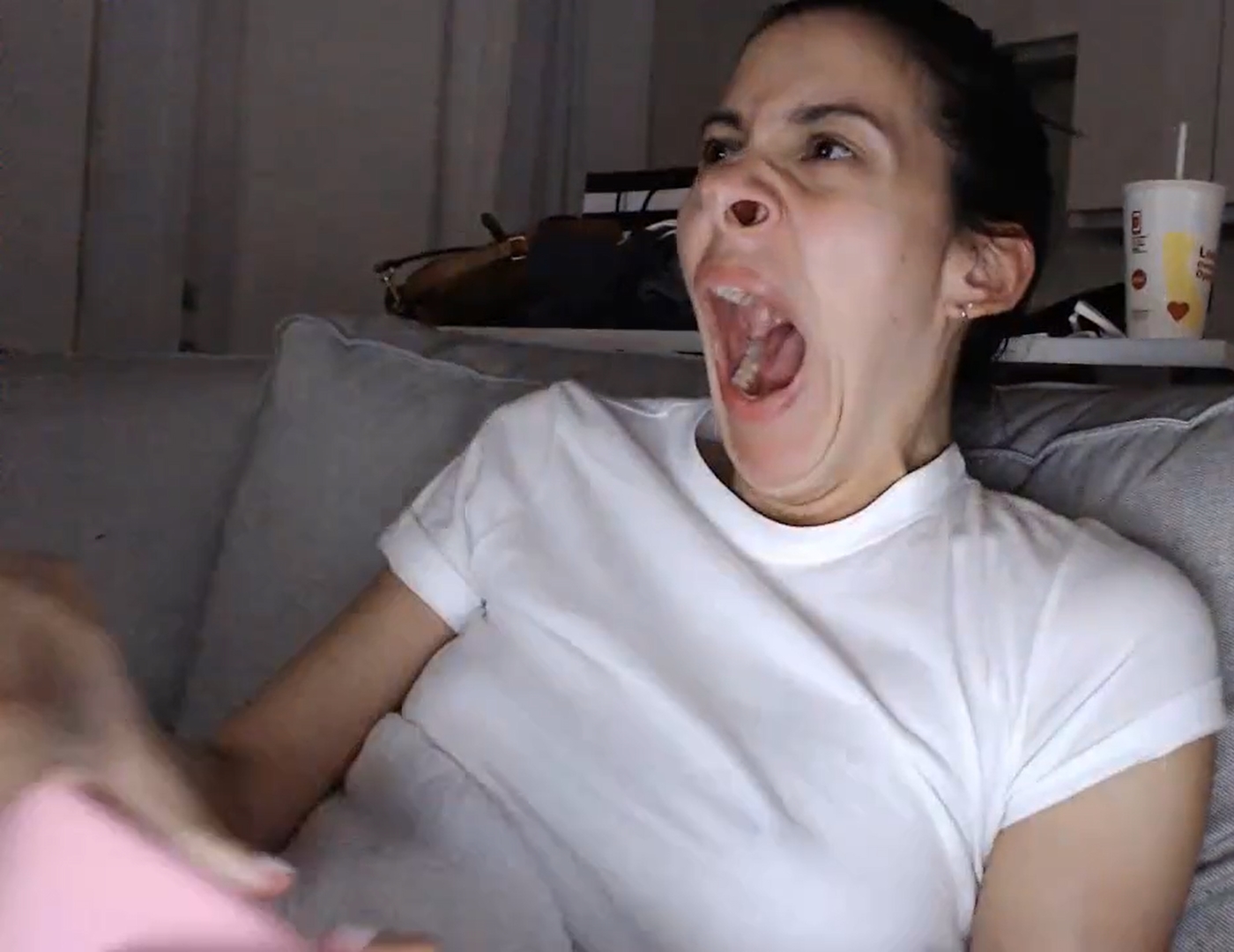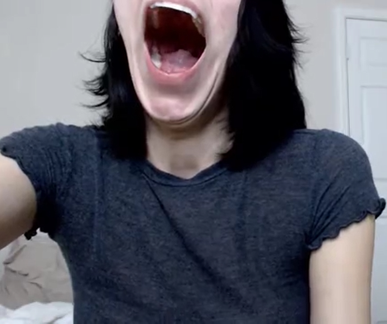 She has a very big mouth, here are screenshots of her massive mouth opening when she yawns